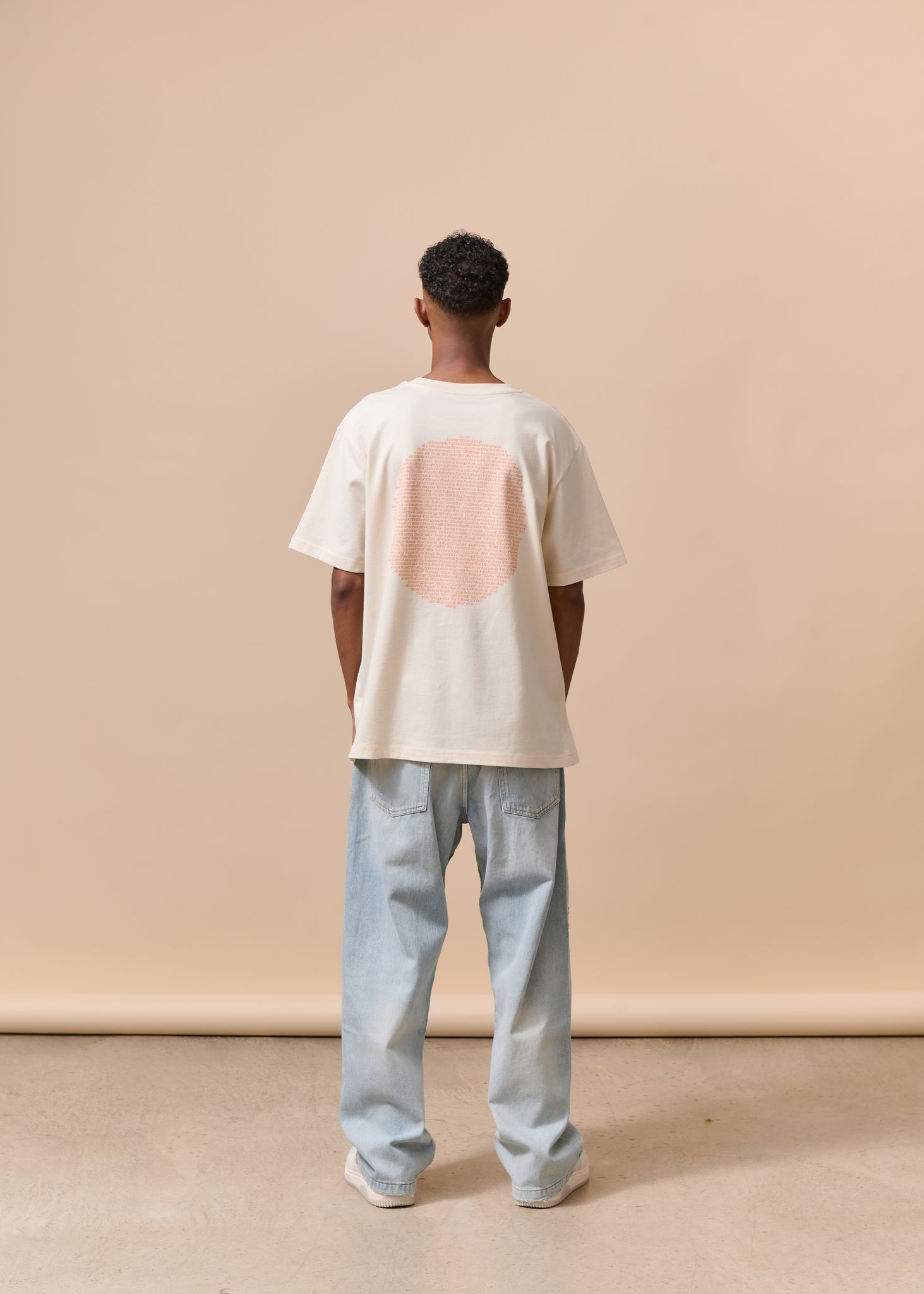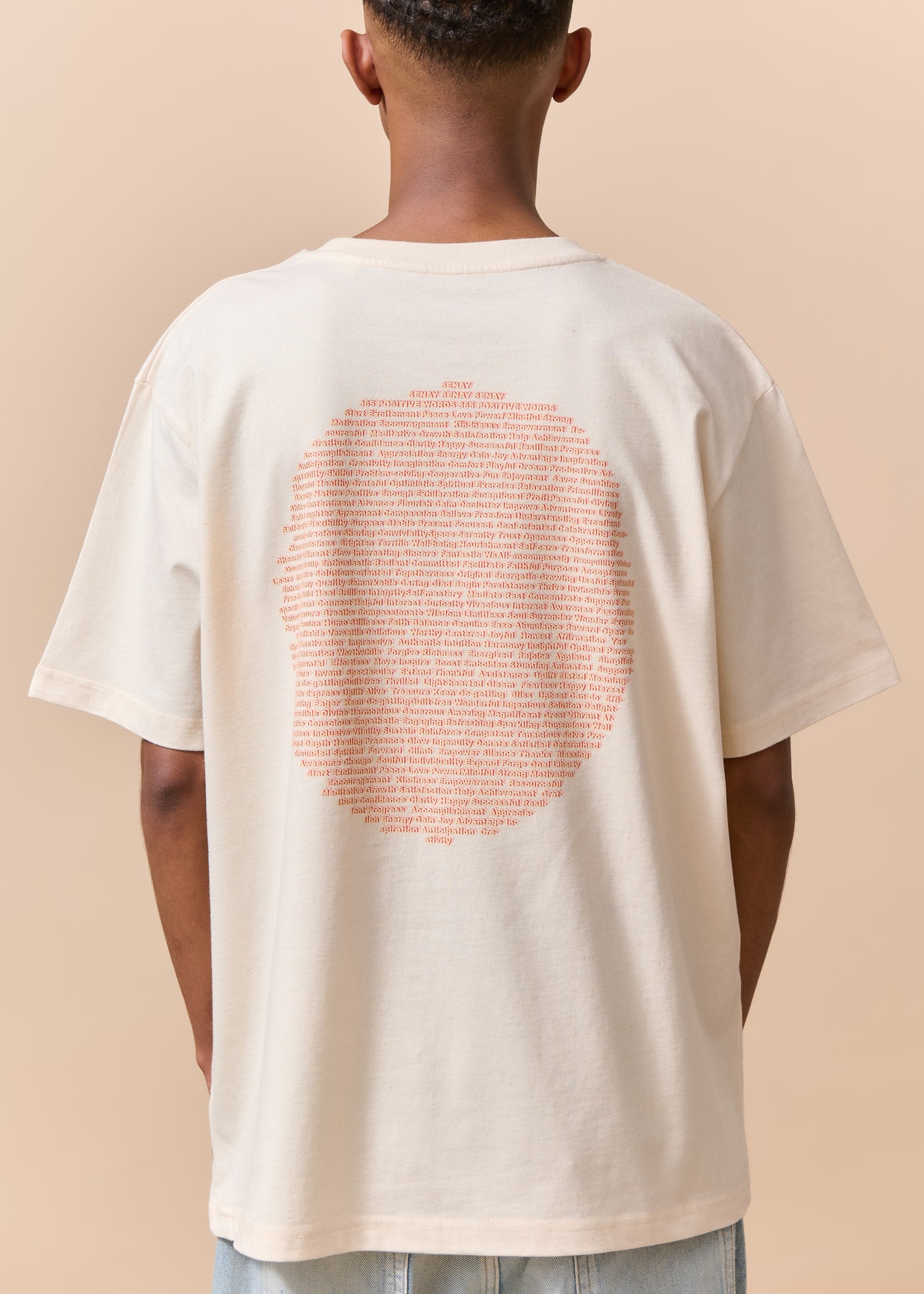 Signature Almond Eye Wisdom T-shirt: Relaxed Neutral T-shirt in Luxury Organic Cotton. Red and Neutral colour Almond Eye print with 100+ wisdom words.