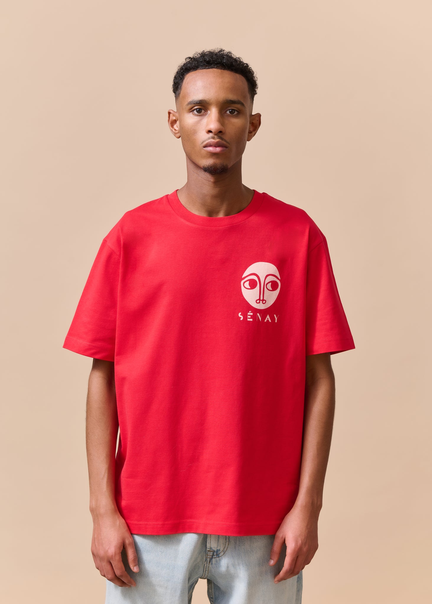 Medium Red T-shirt featuring beige signature almond eye and Senay Logo at front left chest in luxury 100% organic jersey cotton
